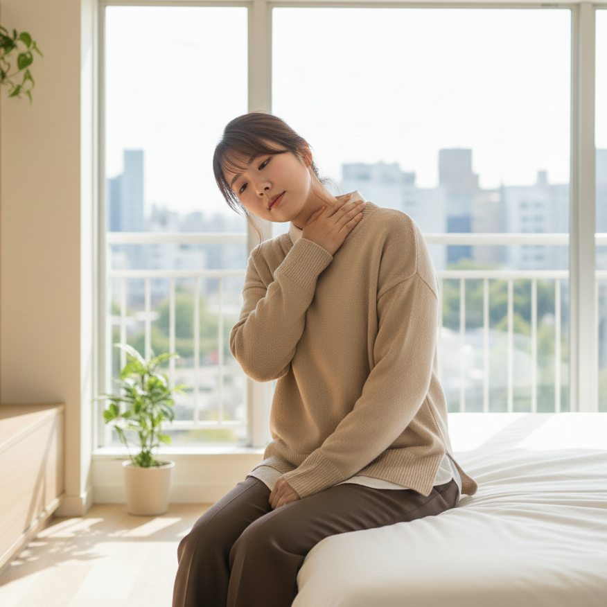 📌 自律神経が乱れ、首・肩まわりが緊張したまま朝を迎えやすくなります💦