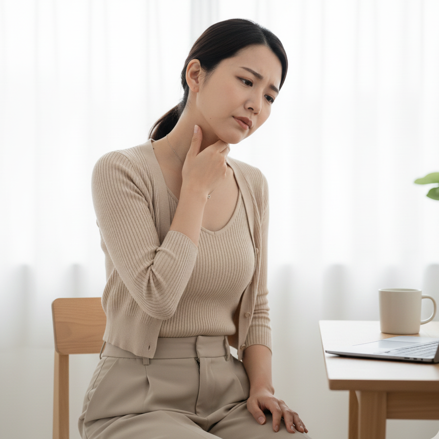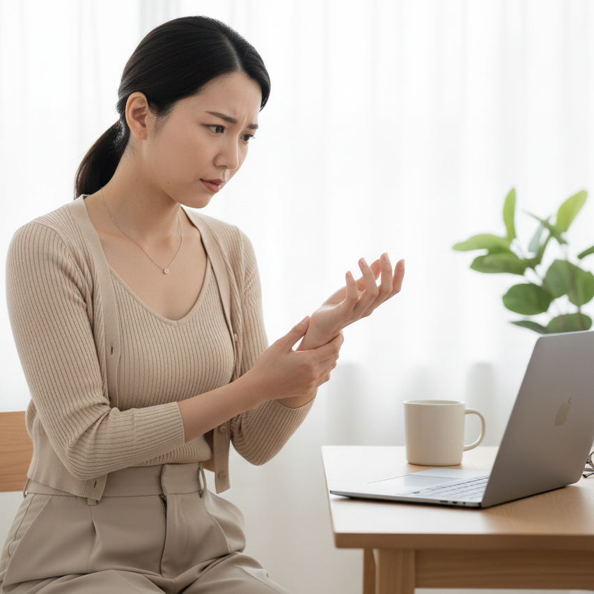実は、このしびれの多くは 首や肩まわりの筋肉の緊張と姿勢 に深く関係しています。