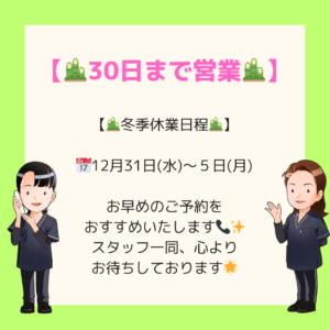 いつもご来院いただきありがとうございます😊 誠に勝手ながら、下記の期間を冬季休業とさせていただきます。 📅 12月31日(水)~ 1月5日(月) 年末年始の前後はご予約が混み合うことが予想されますので、 お早 […]